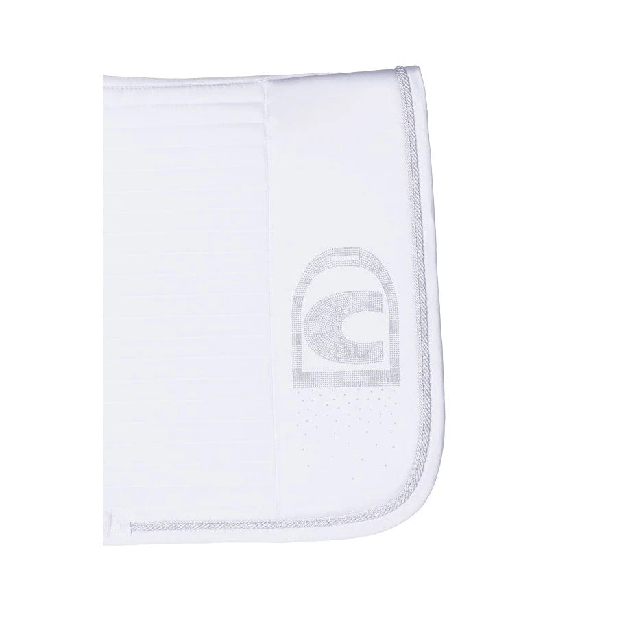 A striking saddle pad made of a slightly shiny, high-quality upper material. Equipped with horizontal stripe quilting on the front. The back of the saddle pad is equipped with a vertical smooth strip with a silver Cavallo glitter logo made of small nailheads. The saddle pad is bordered with two cords of different widths. The wider cord contains an elegant, shimmering lurex thread. The narrow cord impresses in elegant matt silver. The quick-drying and moisture-transporting mesh lining is particularly skin-friendly and offers maximum comfort. A dimensionally stable padding enables the saddle pad to be perfectly positioned on horseback. The upper and lower belt straps are to be fixed with a Velcro fastener.