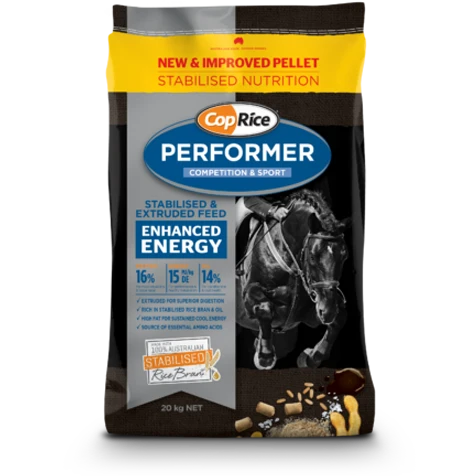 A nutrient dense feed formulated to provide sustained energy for horses in moderate to heavy exercise including endurance, eventing, show jumping, dressage and racing.